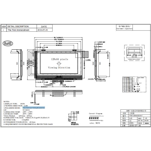 TSG12864102-0-C is a FSTN, transflective, positive graphic LCD module display with 128*64 dots resolution, it use UC1601S as it's driver IC. The display type of this module is FSTN, and the outline size of this segment resolution LCD module is 72.5*47*2.8 mm, and the view area is 67.5*34.6 mm, and Its best view direction is 12 o'clock.